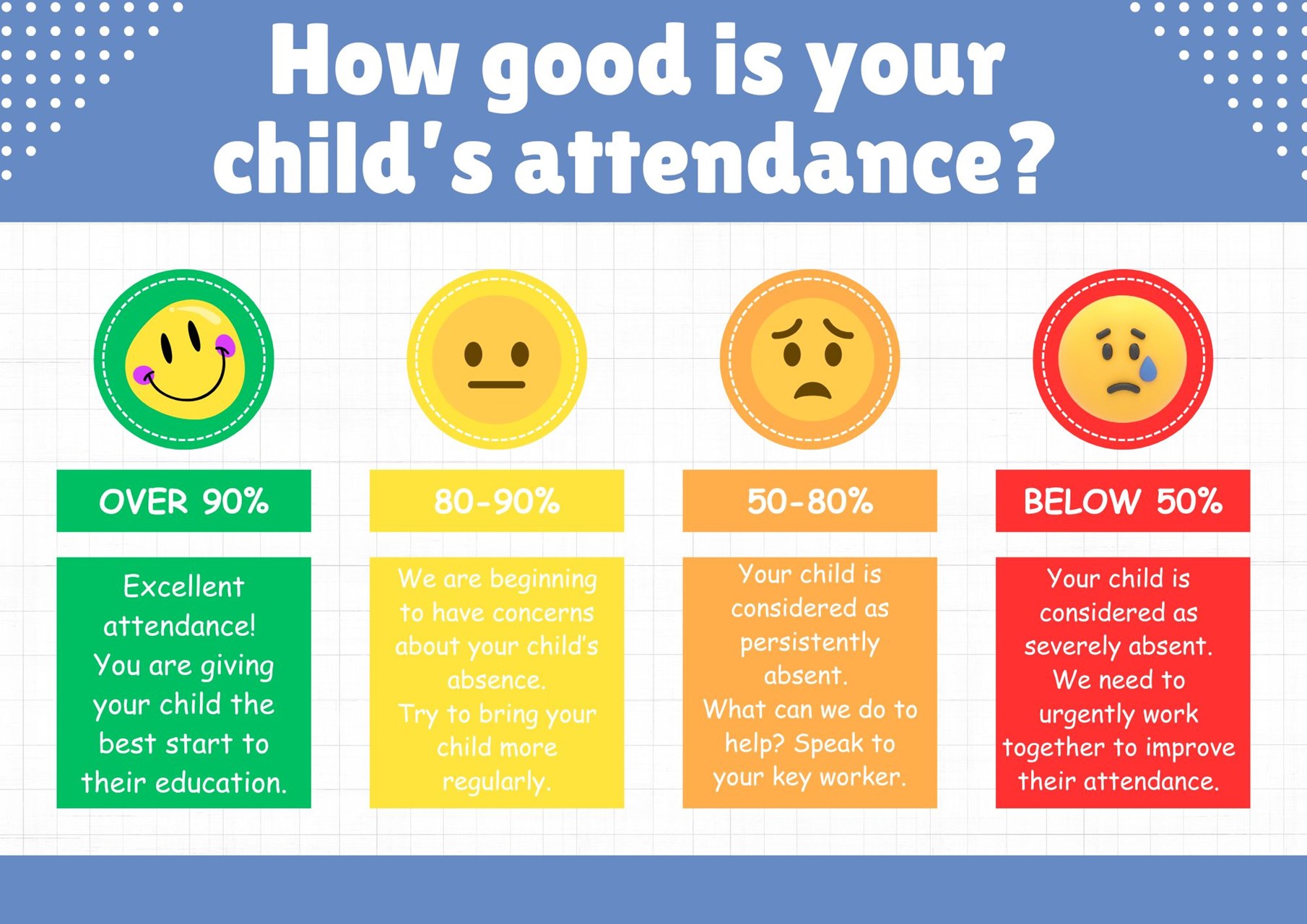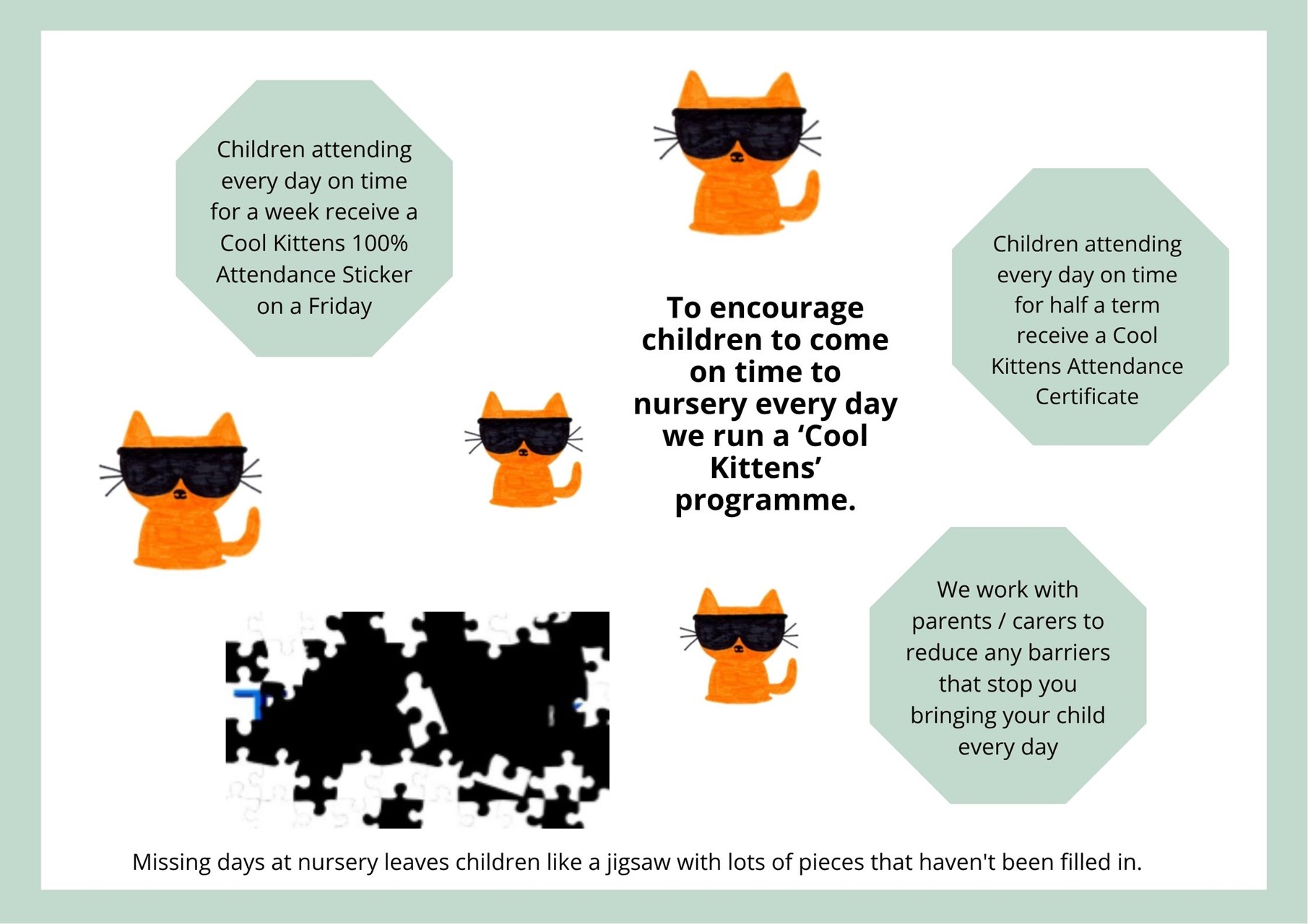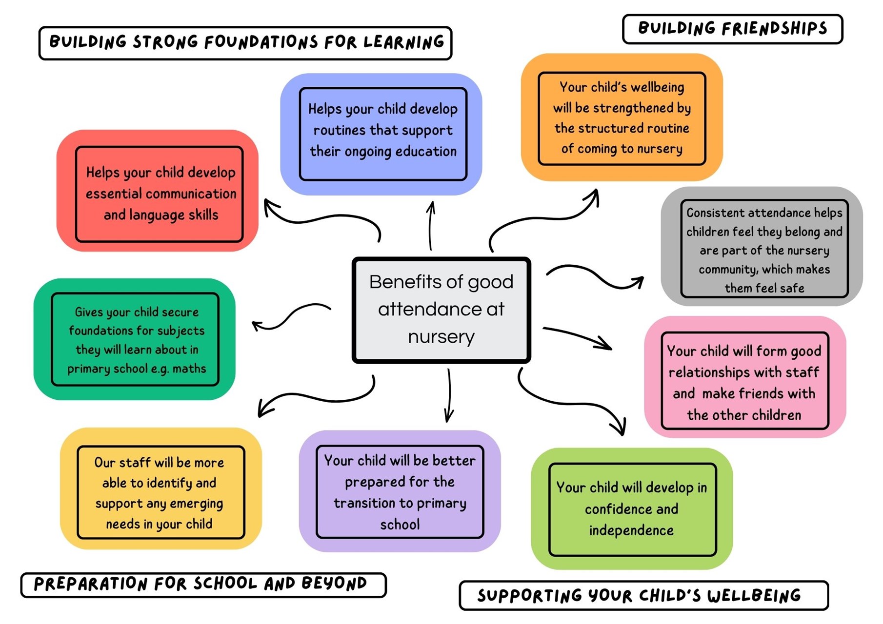 Children with good attendance feel secure in the routine of nursery, settle in more quickly, make friends easier and benefit from all the learning opportunities that happen every day.